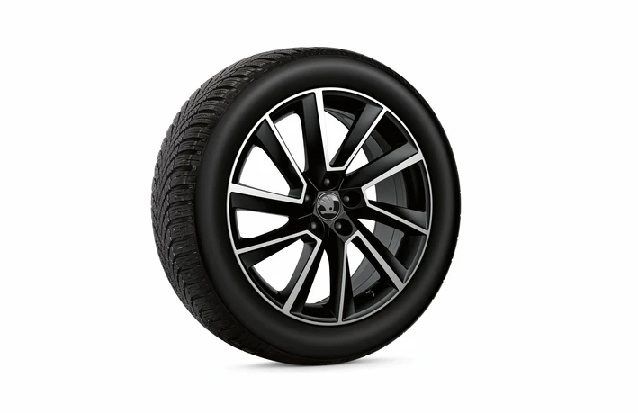 Komplet zimskih platišč, ki ga sestavljajo štiri 18-palčna črna aluminijasta platišča “Škoda Blade” z zimskimi pnevmatikami Bridgestone Blizzak 6 dimenzij 215/45 R18 93V.