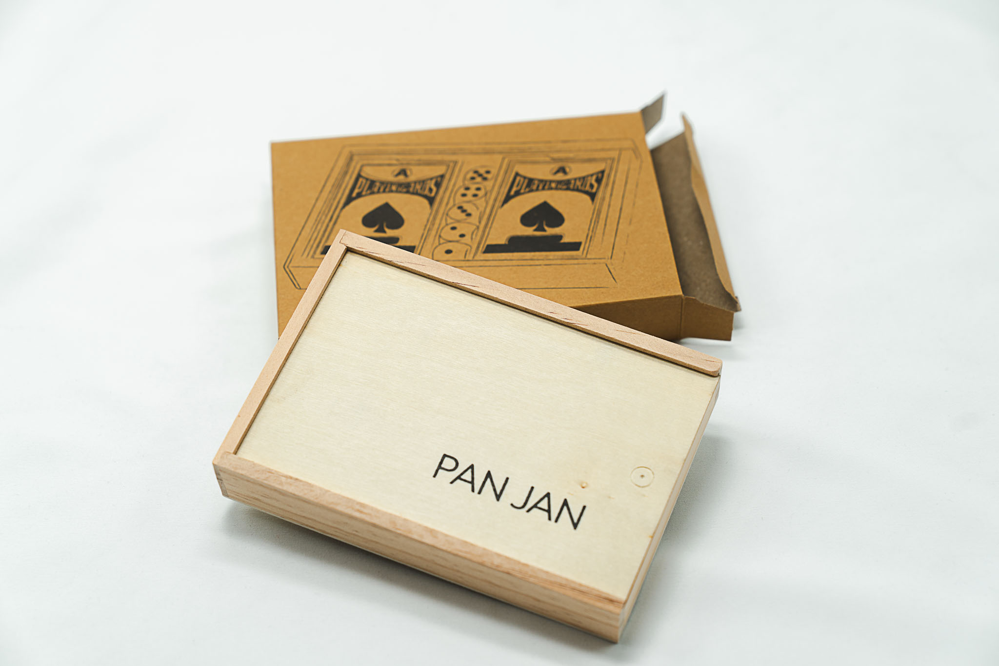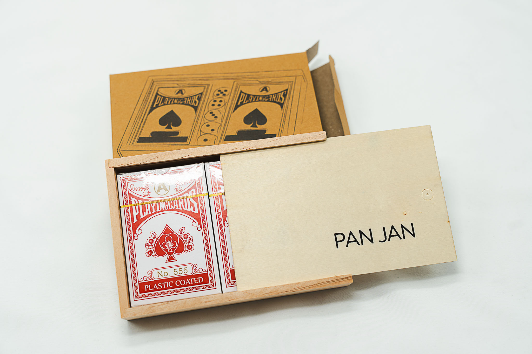 Dva seta kart za poker, 5 lesenih kock, v leseni embalaži s pokrovom, 15 x 10,3 x 2,6 cm