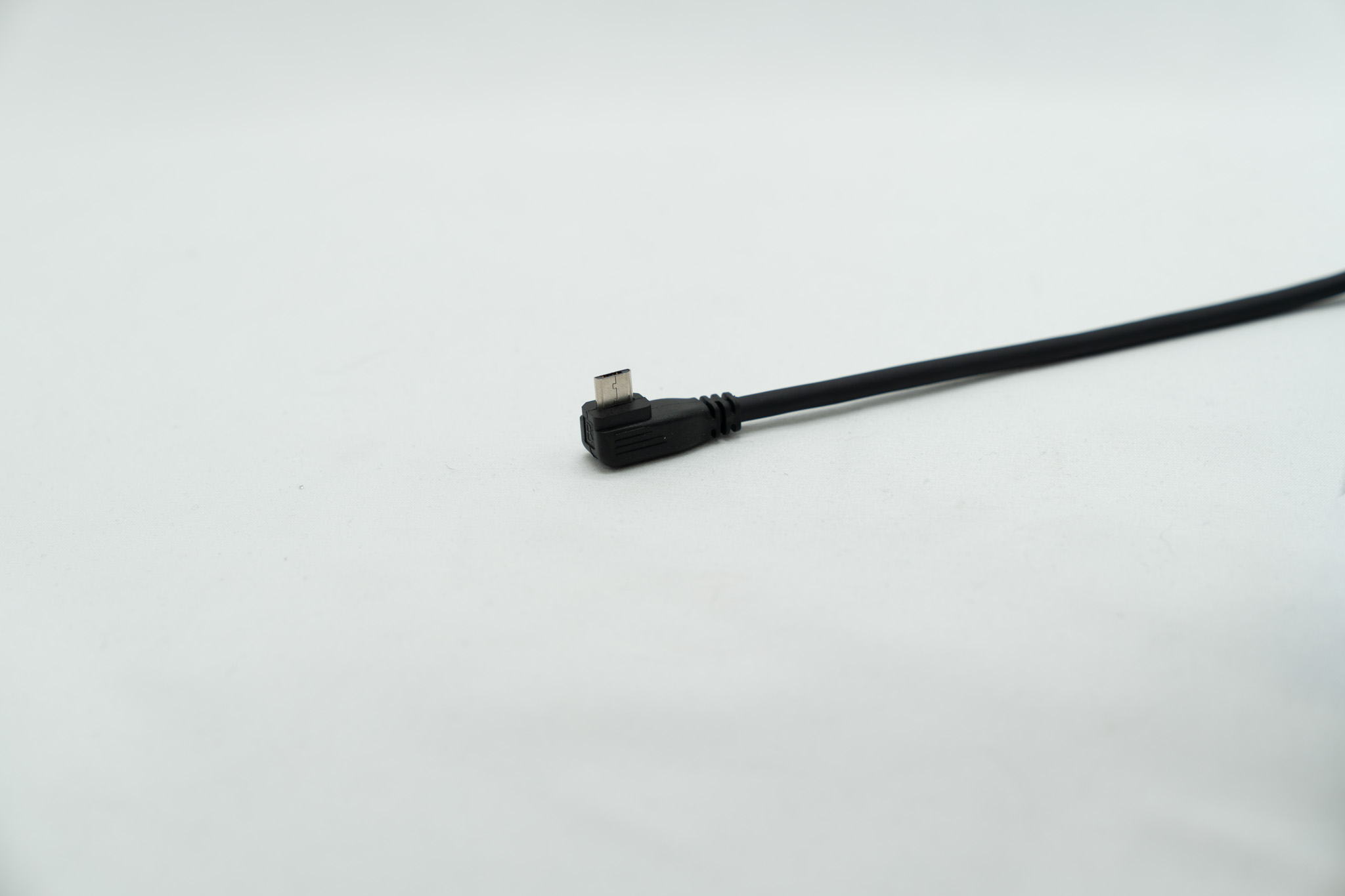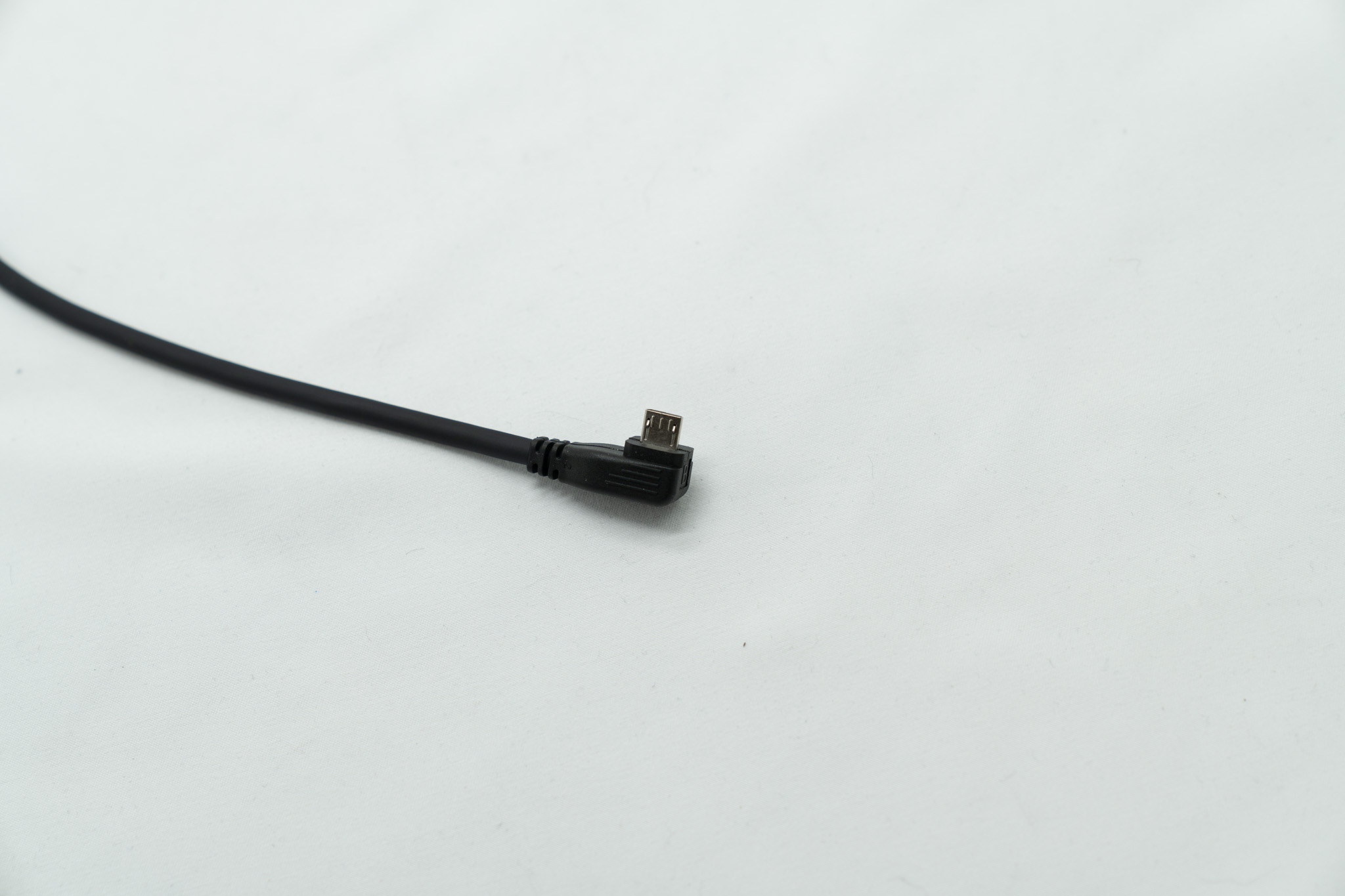 Črn priključni kabel s kotnim micro-USB priključkom. Omogoča polnjenje in prenos podatkov v tesnih prostorih ter preprečuje lomljenje kabla na spoju.
