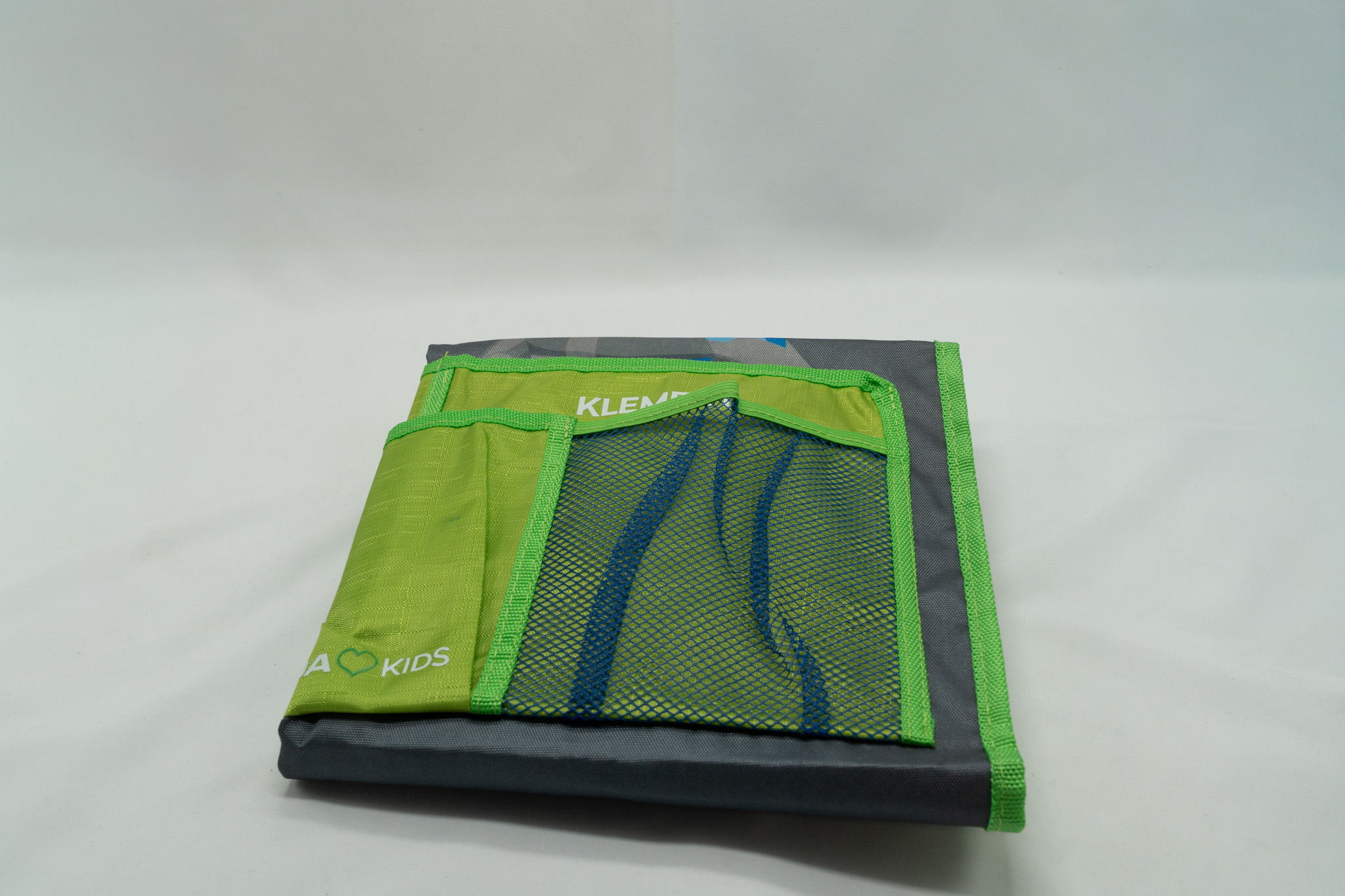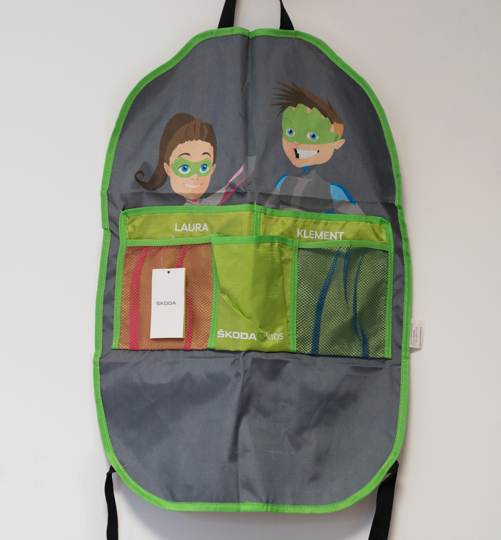 Siva zaščita za hrbtni del avtomobilskega sedeža iz serije ŠKODA Kids z zabavnima risanima likoma. Vključuje dva večja žepa z napisoma “LAURA” in “KLEMENT” ter tri mrežaste žepke za organizirano shranjevanje igrač in potrebščin, z zelenimi obrobami in logotipom ŠKODA.